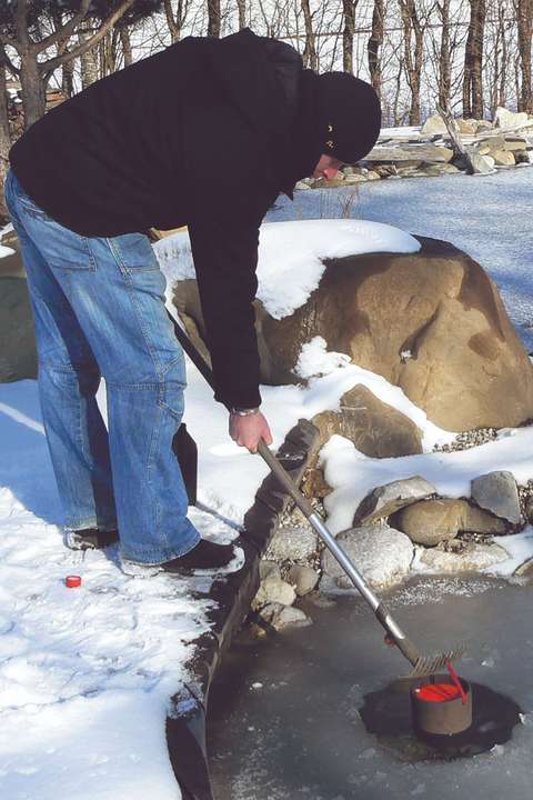Im Winter ziehen sich die Fische in die tieferen Teichebenen zurück. Ihr Stoffwechsel kommt weitgehend zum Erliegen, sie fallen in eine Art Winterstarre und essen nichts mehr. Doch Sauerstoff brauchen sie weiterhin. Um den Sauerstoffgehalt im Wasser aufrechtzuerhalten, helfen Eisfreihalter und Pflanzenstiele, die durch das Eis ragen. Sinnvoll sind außerdem sogenannte Oxydatoren, die auch unter einer geschlossenen Eisdecke für genügend Sauerstoff im Wasser sorgen. Sie arbeiten ohne Strom und Schläuche. Die genaue Funktionsweise ist etwa unter www.oxydator.de erklärt.