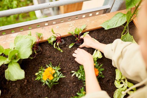 Beim Auffüllen des Hochbeets kommt es außerdem auf die richtige Menge an. Gut zehn bis 20 Zentimeter sollte die oberste Schicht betragen. Dabei sollten es Gartenbesitzerinnen und -besitzer aber nicht übertreiben: Ein kleiner Rand bis zur Oberkante des Hochbeets hilft, Wasser zu halten, und verhindert, dass Erde bei Starkregen oder beim Gießen weggeschwemmt wird. Ein weiterer Tipp: Mit der frischen Erde gelangt zugleich neue Energie ins Beet. Das sollten Freizeitgärtnernde bei der Auswahl der Bepflanzung berücksichtigen, ergänzt Werner Peitzmann: „Um die frischen Nährstoffe optimal zu verwerten, empfehlen sich zunächst Pflanzen mit hohem Nährstoffbedarf.“ Dazu gehören zum Beispiel starkzehrende Gemüsearten wie Tomaten, Zucchini und Paprika, aber auch Obstpflanzen wie Erdbeeren.