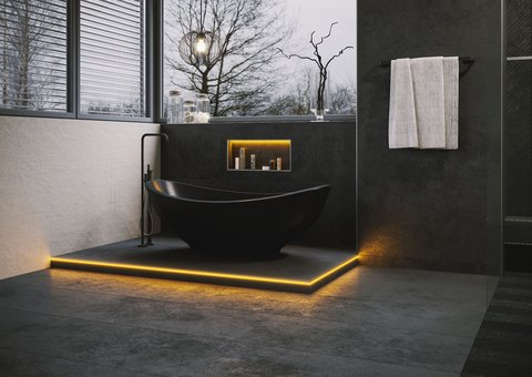 Mit einer Vielzahl von Anwendungsmöglichkeiten und hoher Flexibilität bei Lichttemperatur und -farbe entfalten die Lichtprofile der Liprotec-Serie von Schlüter-Systems etwa ihr volles Potenzial. Sie lassen sich als Lichtleiste in der Wand, als illuminierte Sockelleiste, als indirekte Beleuchtung für eine Wandscheibe oder als Akzent in Wandnischen einsetzen. Besonders im Zusammenspiel mit hochwertigen Materialien wie Keramik und Naturstein können auf diese Weise gestalterische Highlights in der Inneneinrichtung entstehen. Dank ihrer Schutzklasse IP 67 finden die beleuchteten Profile auch im Badezimmer Verwendung und tauchen sogar den Duschbereich in stimmungsvolles Licht.