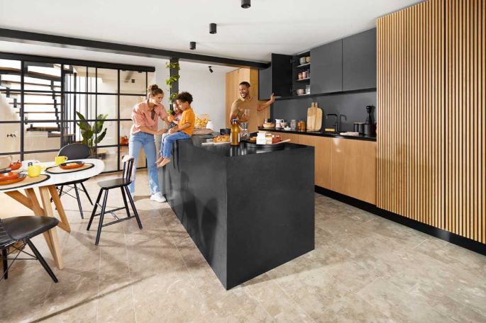 Klar, die persönlichen Präferenzen spielen eine wichtige Rolle – Papa David wünscht sich zum Beispiel eine stylische Inselküche. Neben der Form sind natürlich auch die Farben der Küche ein grosses Thema. Diese zieht sich im besten Fall komplett durch – also auch mit passenden Zargendesigns für die Schubladen. Eine grosse Farb- und Designauswahl bietet zum Beispiel LEGRABOX von Blum. Auch Scharniere sind übrigens in unterschiedlichen Farben erhältlich: Neben der klassischen Nickelvariante bietet Blum seine Standardscharniere auch in der Farbe Onyxschwarz.