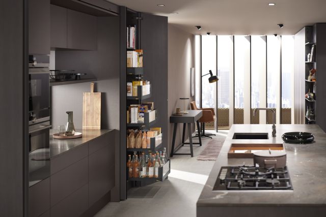 Die vierköpfige Familie Meyer kocht und backt sehr viel, da braucht es genug Platz für Vorräte. Aus Platzgründen verzichten sie aber auf eine Speisekammer. Es ist also notwendig, für mehr Stauraum in der Küche zu sorgen. Das geht besonders gut mit einem grossen Vorratsschrank wie SPACE TOWER von Blum. Genug Platz dafür ist unter anderem in einer G-Küche, diese rahmt den Raum fast vollständig mit Küchenzeilen ein und bietet entsprechend viel Arbeitsfläche und Stauraum.