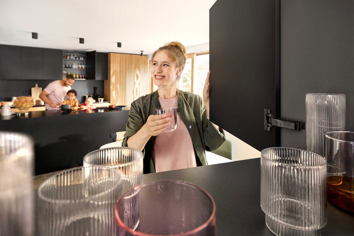 Klar, die persönlichen Präferenzen spielen eine wichtige Rolle – Papa David wünscht sich zum Beispiel eine stylische Inselküche. Neben der Form sind natürlich auch die Farben der Küche ein grosses Thema. Diese zieht sich im besten Fall komplett durch – also auch mit passenden Zargendesigns für die Schubladen. Eine grosse Farb- und Designauswahl bietet zum Beispiel LEGRABOX von Blum. Auch Scharniere sind übrigens in unterschiedlichen Farben erhältlich: Neben der klassischen Nickelvariante bietet Blum seine Standardscharniere auch in der Farbe Onyxschwarz.