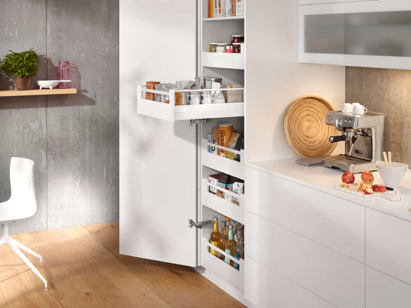 Die vierköpfige Familie Meyer kocht und backt sehr viel, da braucht es genug Platz für Vorräte. Aus Platzgründen verzichten sie aber auf eine Speisekammer. Es ist also notwendig, für mehr Stauraum in der Küche zu sorgen. Das geht besonders gut mit einem grossen Vorratsschrank wie SPACE TOWER von Blum. Genug Platz dafür ist unter anderem in einer G-Küche, diese rahmt den Raum fast vollständig mit Küchenzeilen ein und bietet entsprechend viel Arbeitsfläche und Stauraum.