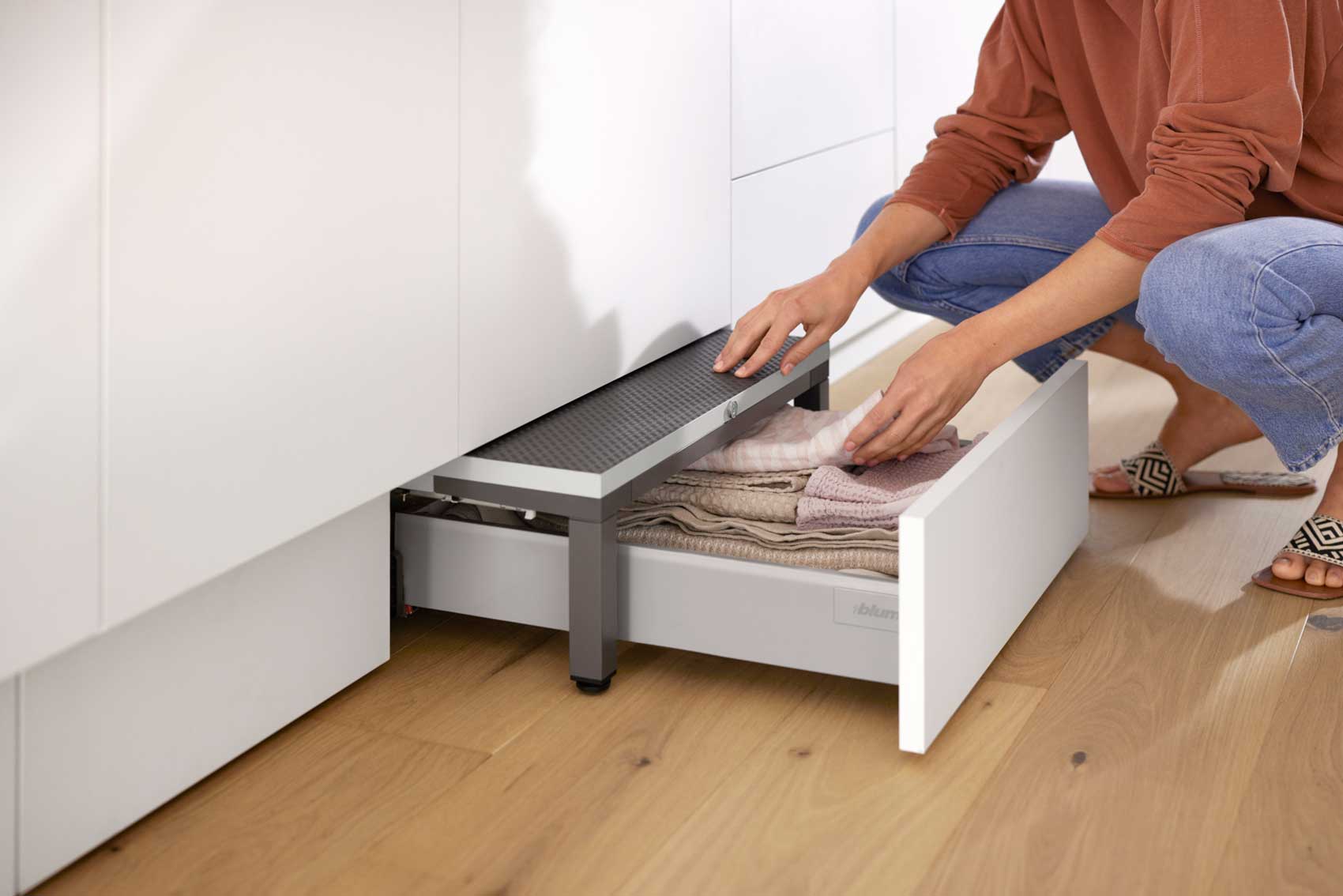 Der Platz entscheidet mit, welche Art von Küche überhaupt einziehen kann und Sinn macht. Ist etwa nur ein kleiner Raum für die Küche eingeplant, kann nur eine schlanke Lösung umgesetzt werden, wie zum Beispiel eine L-Küche. Bei wenig Platz zahlt es sich übrigens aus, Möglichkeiten zu nutzen, die mehr Stauraum bringen, wie etwa die Sockellösung SPACE STEP von Blum, die sogar eine extra Schublade und eine praktische Tritthilfe in den Möbelsockel bringt.